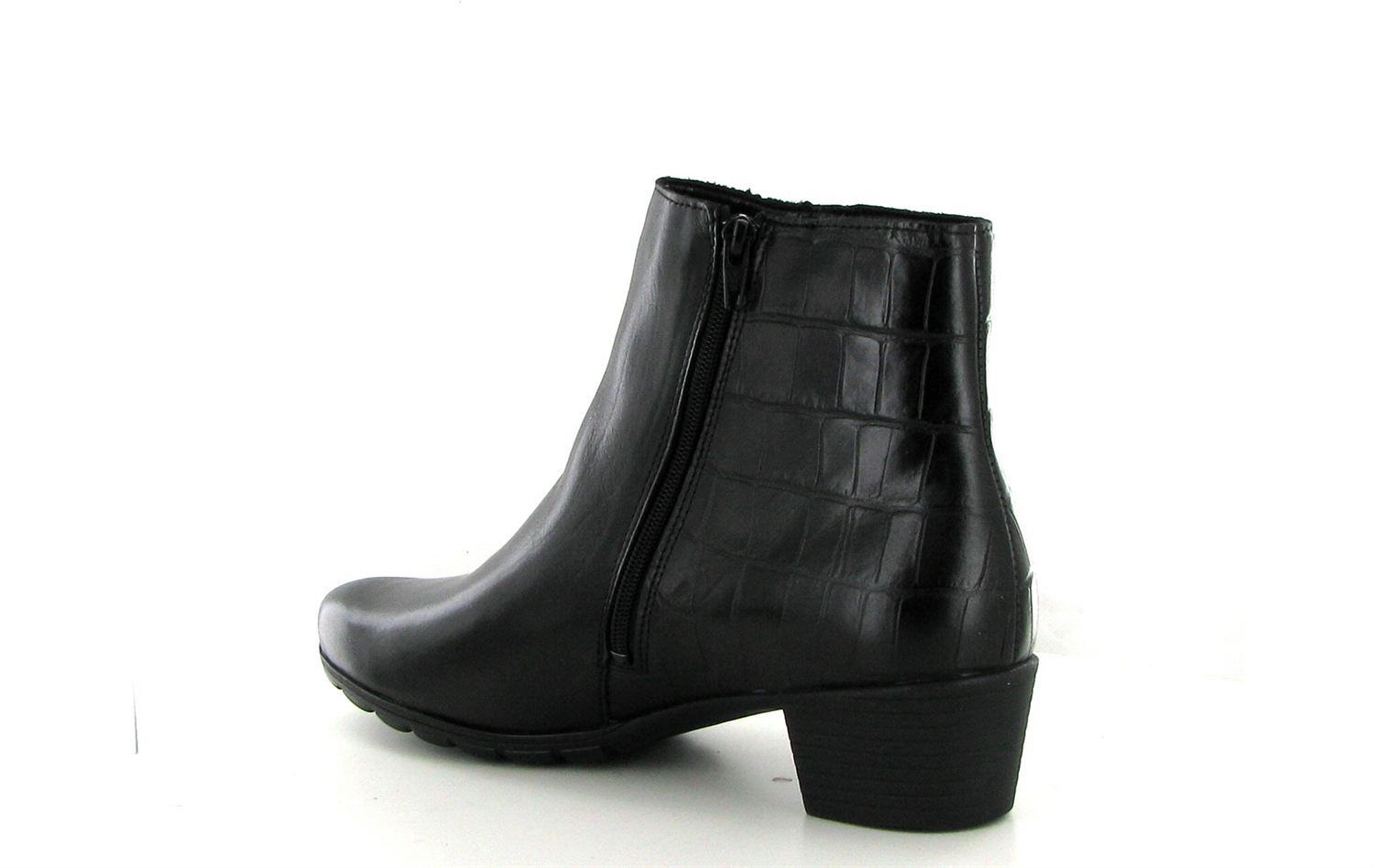 Bottines à zip en cuir noir, très confortables, marche parfaite avec sa semelle étudiée pour garder votre pied maintenu tout au long de votre journée. Petit talon très confortable.