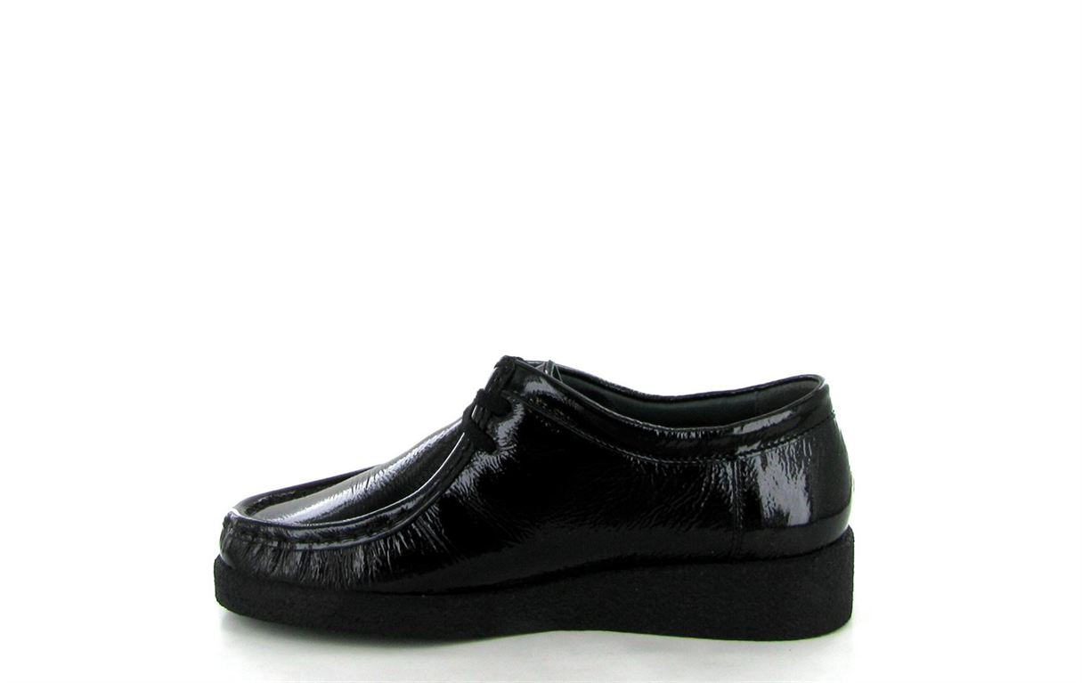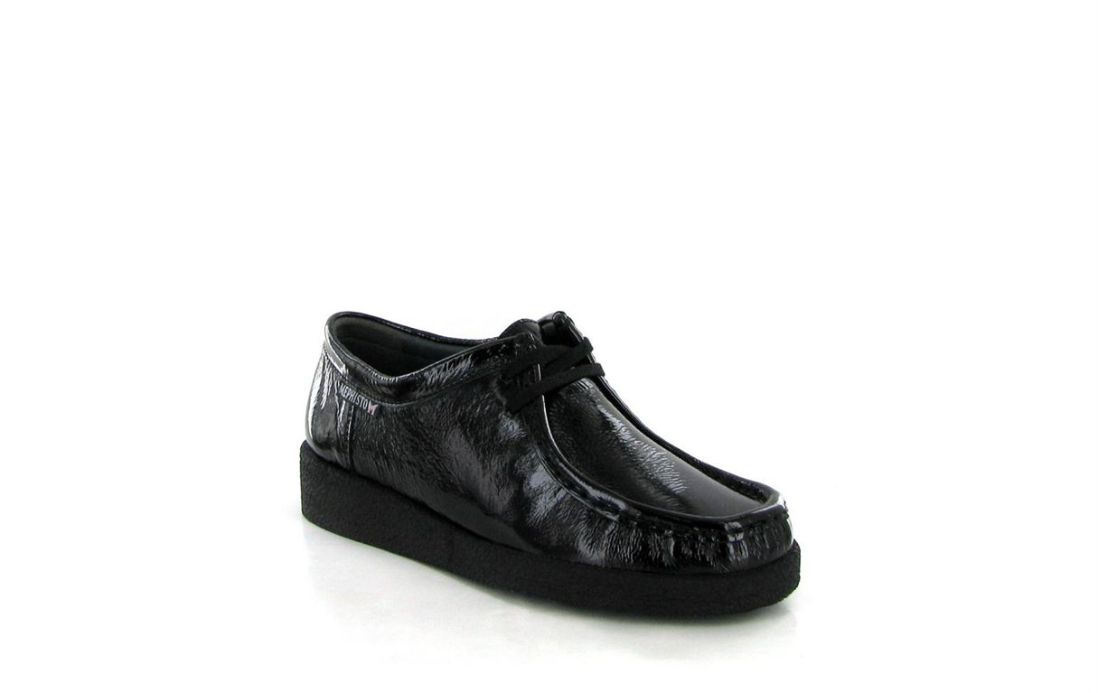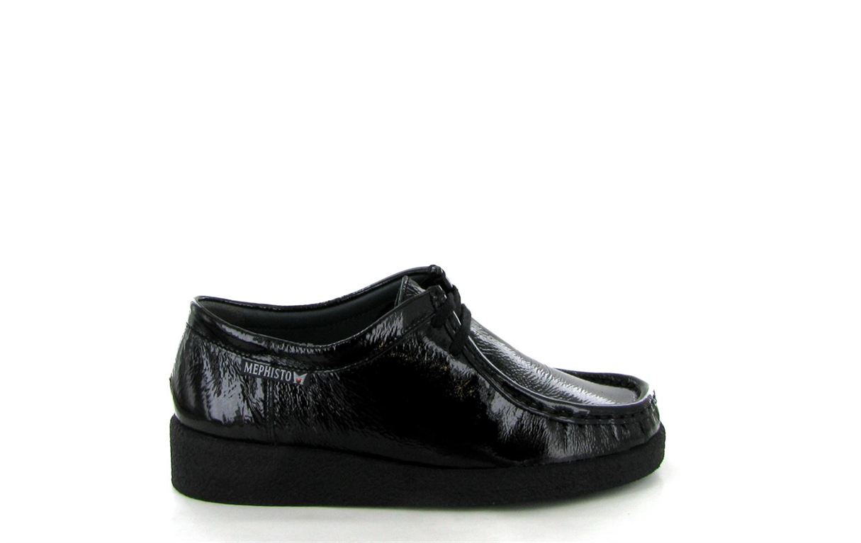 Votre Mephisto derby femme en cuir vernis noir ajustable avec un lacet.