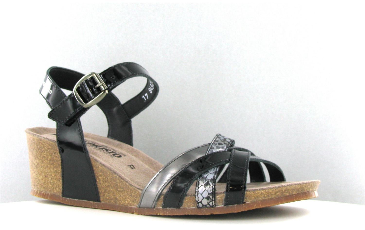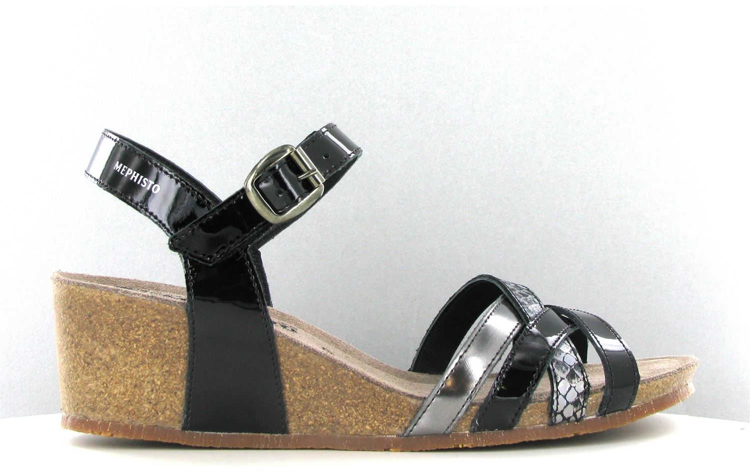 Elégant nu-pied à talon compensé femme Mado en cuir vernis noir de chez Mephisto de fabrication française à découvrir avec Breuil chaussures,