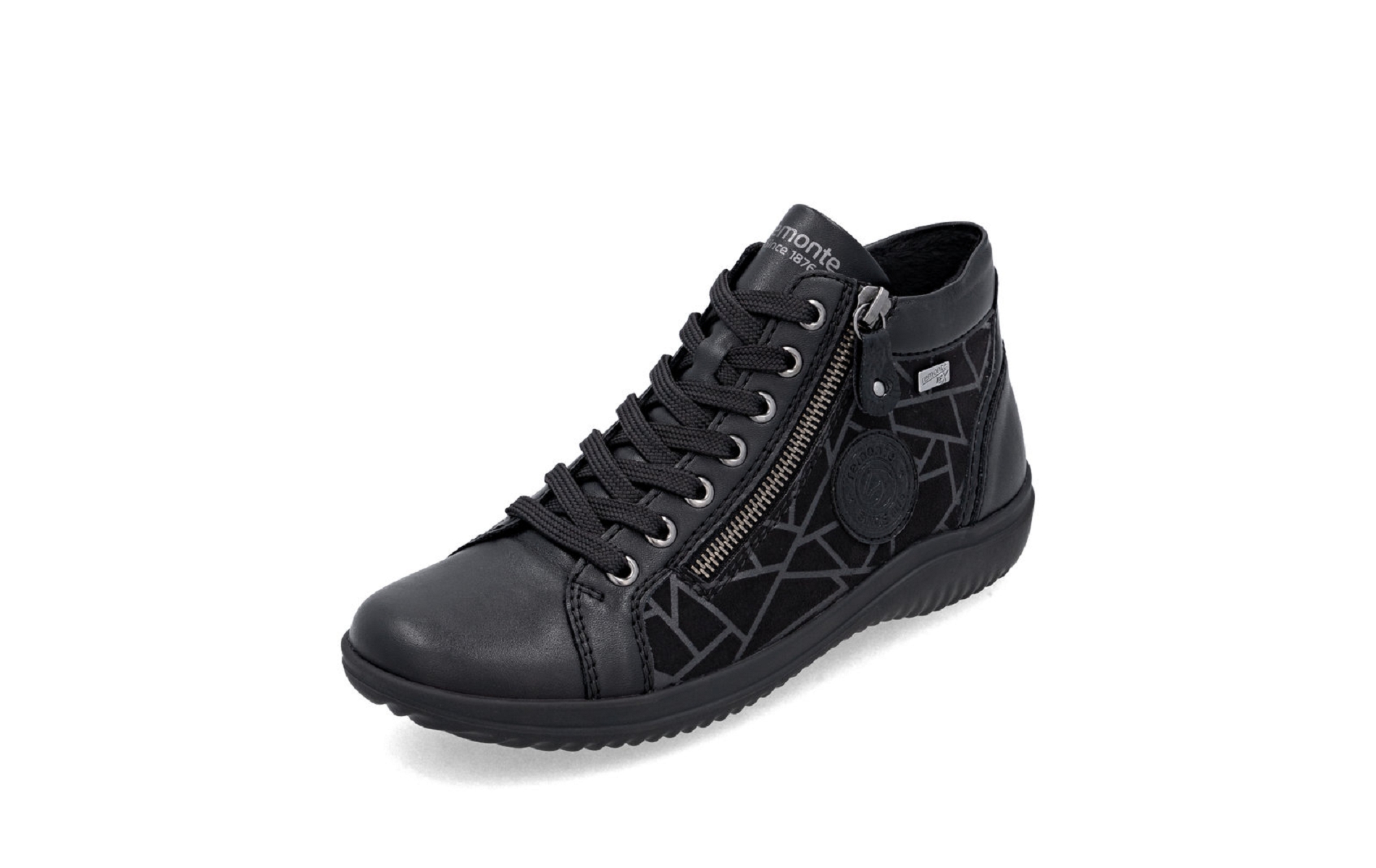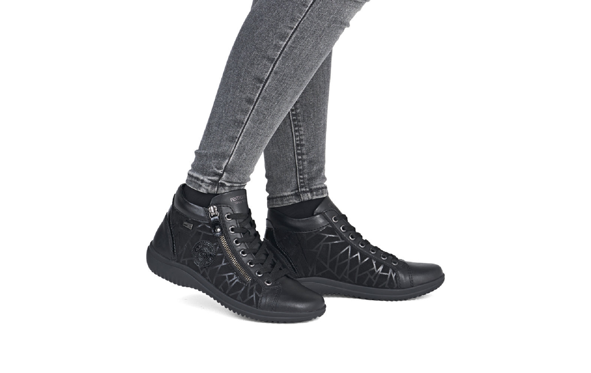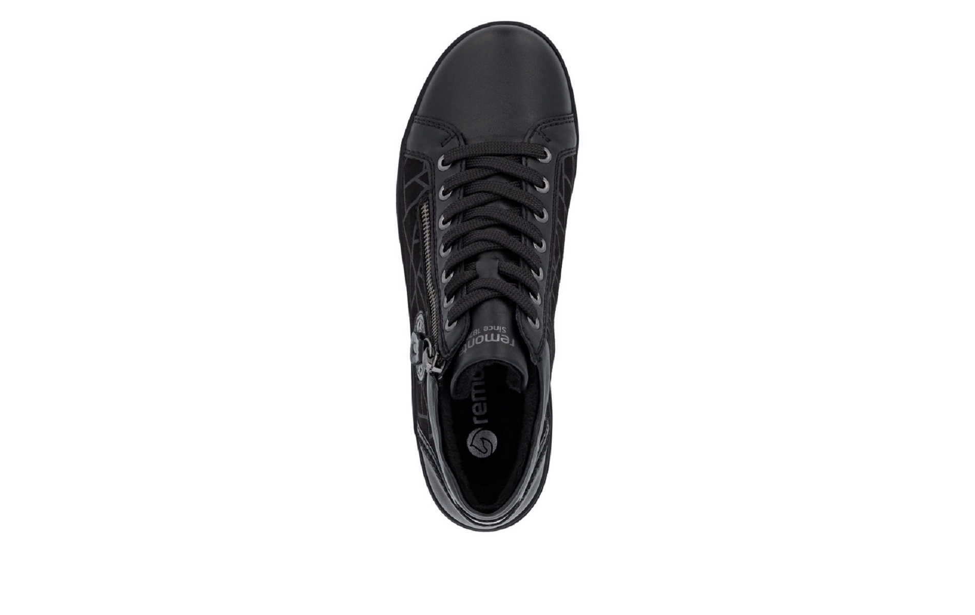 Remonte D1E72 00 est une chaussure montante femme noir avec imprimé géometrique.