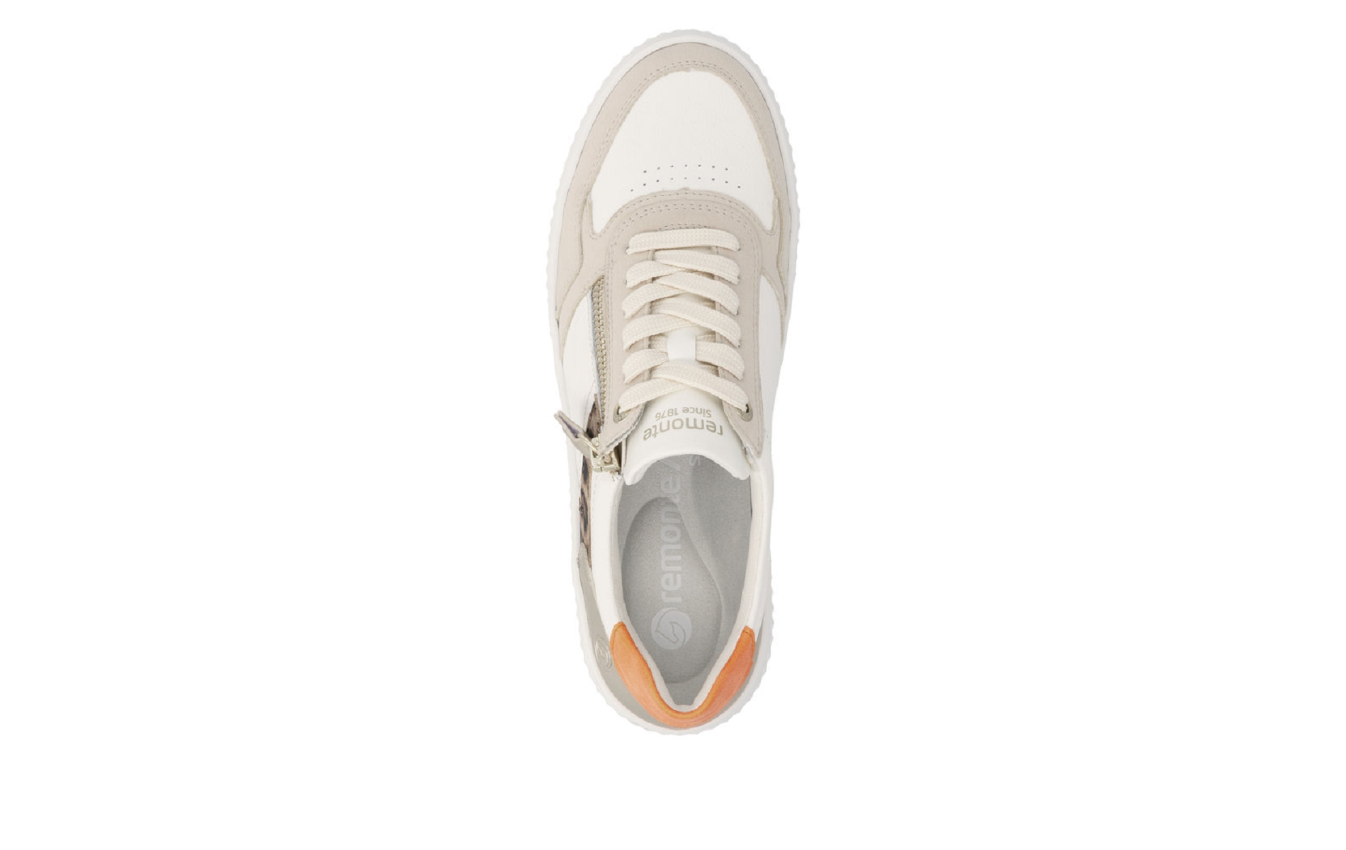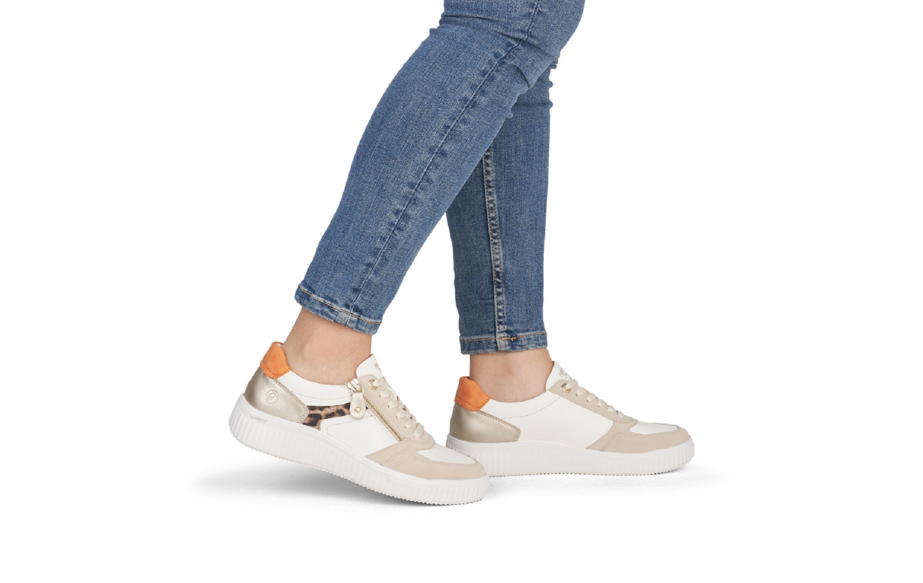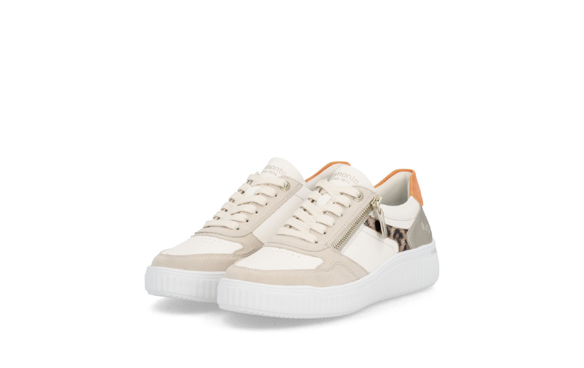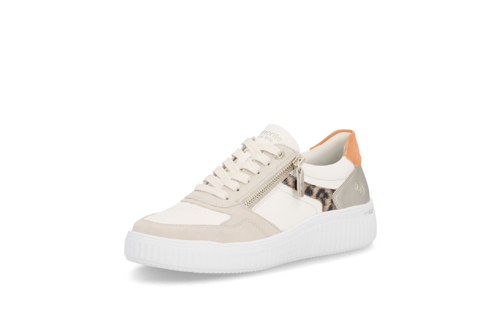 Remonte D3E05 81 est une tennis femmeen cuir enduit blanc,léopard et orange .