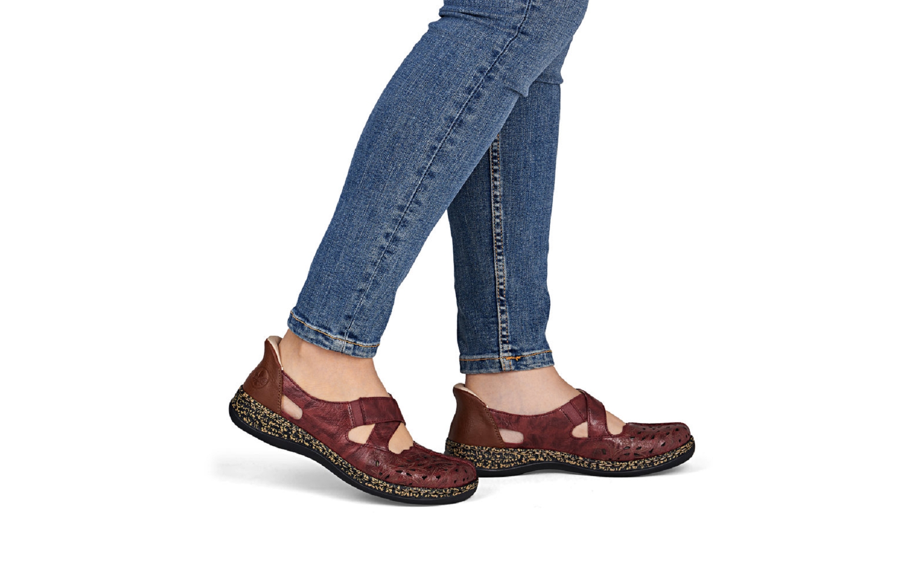Cette chaussure qui est un mix entre une tennis et une ballerine avec son velcros sur le coup de pied est à découvrir chez Rieker-webstore.fr sera facile à chausser avec sa tige chausse pied.