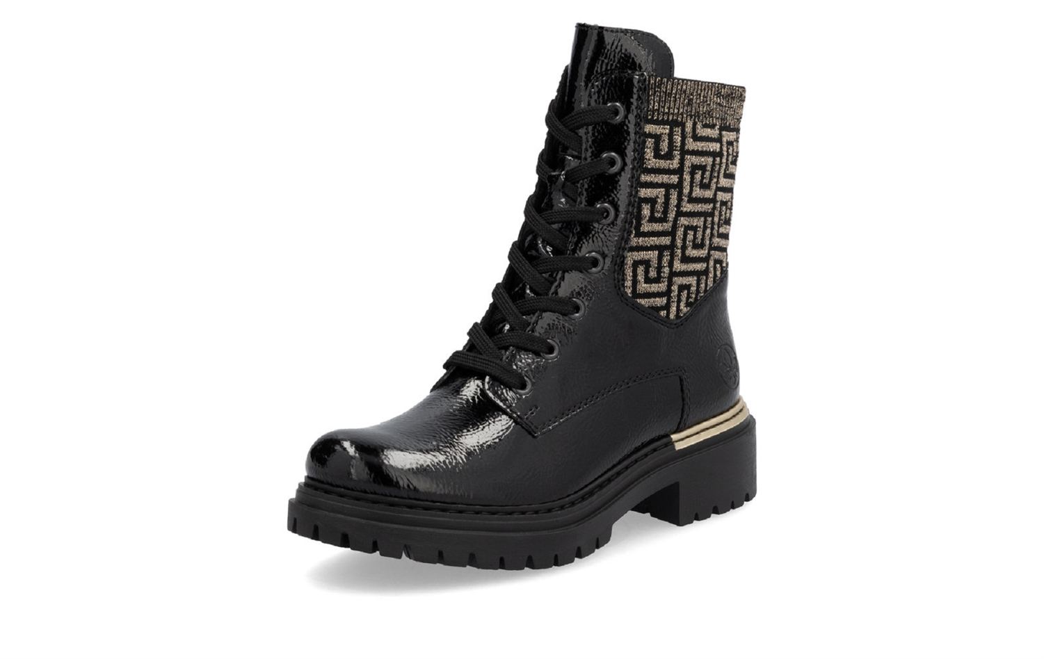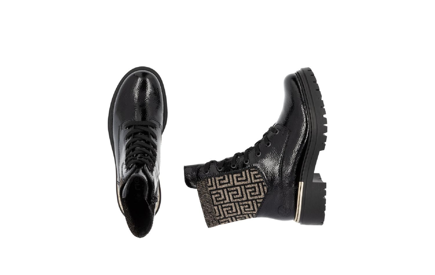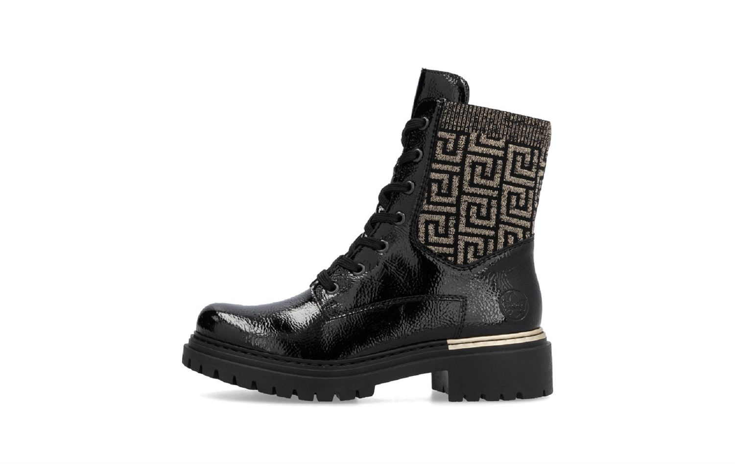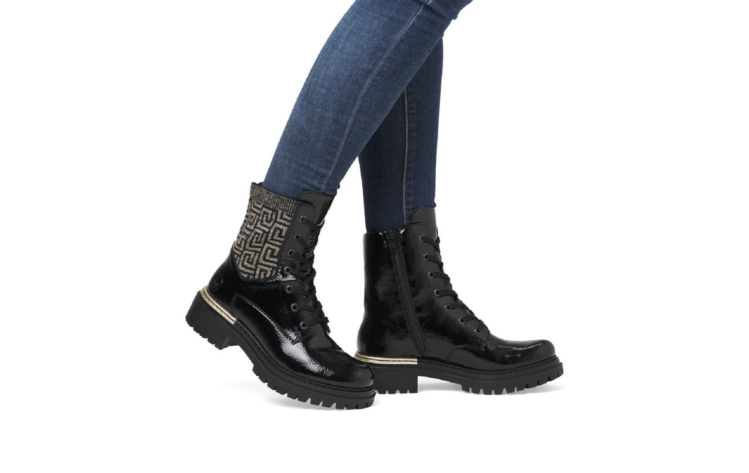 Bottine femme Rieker72607 00 en imitation cuir noir et textile.