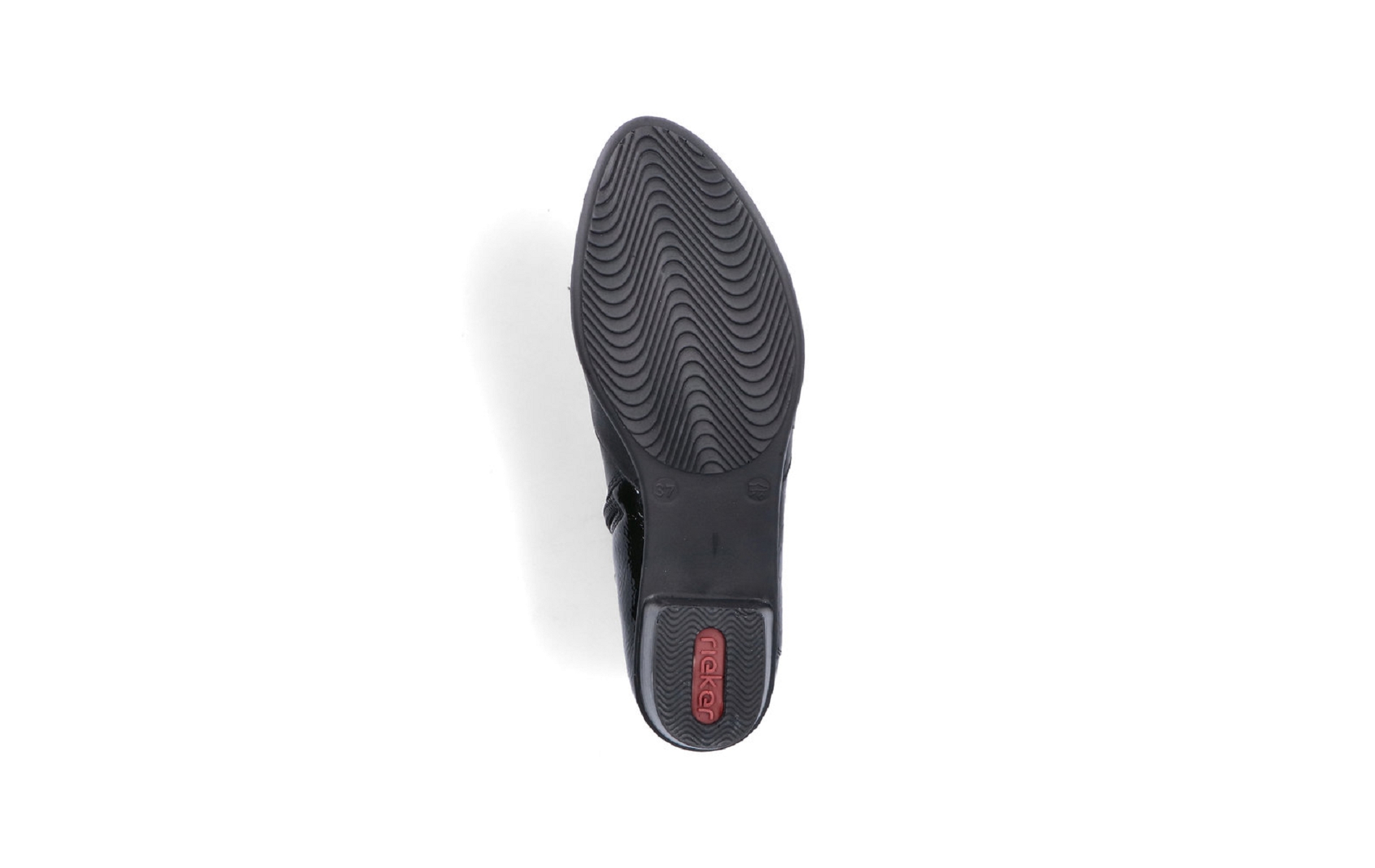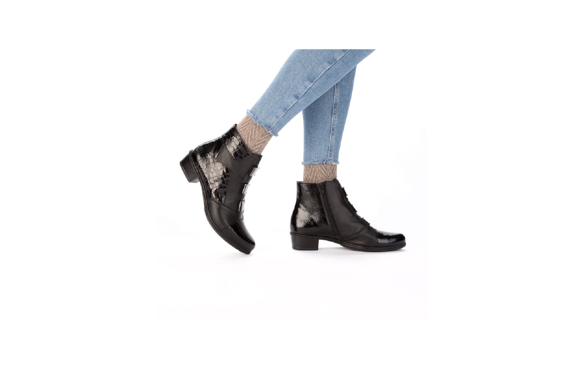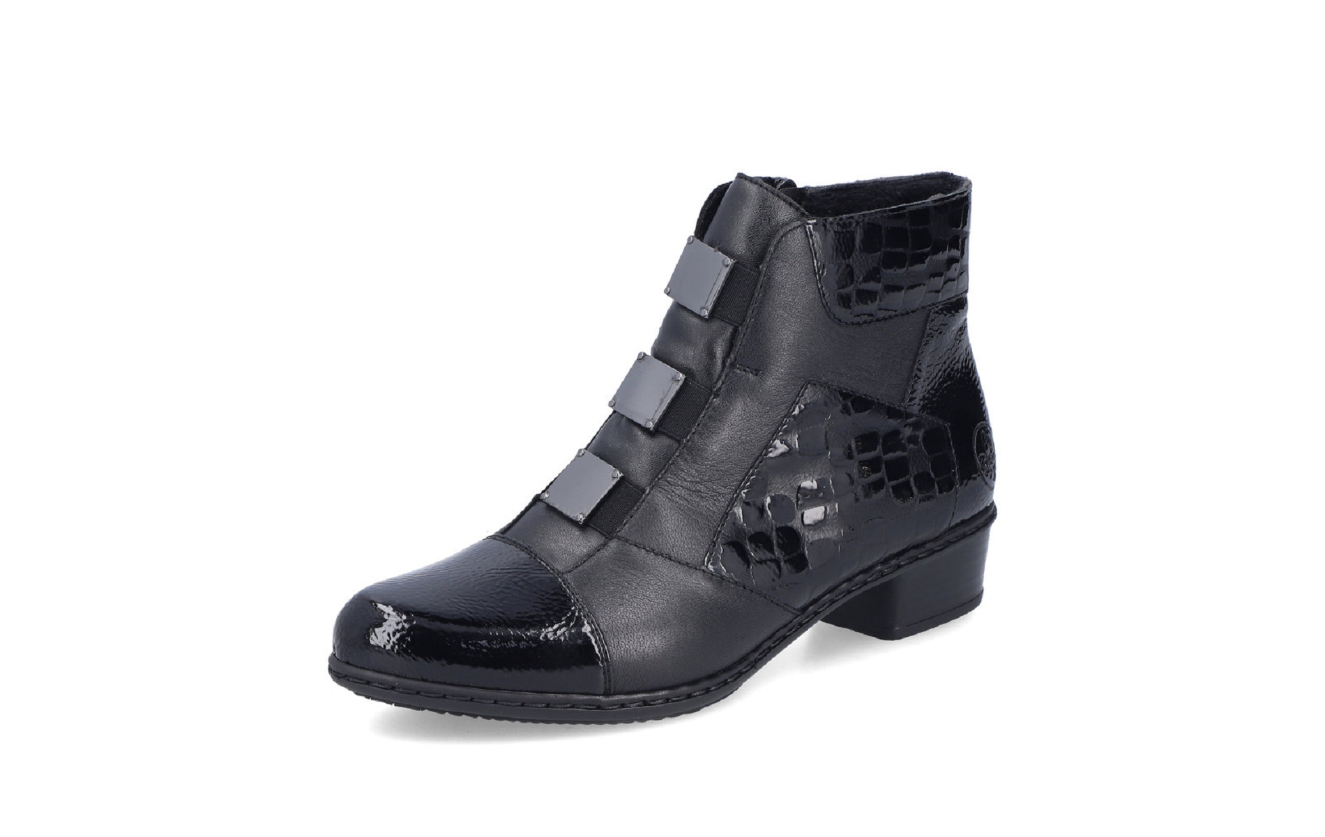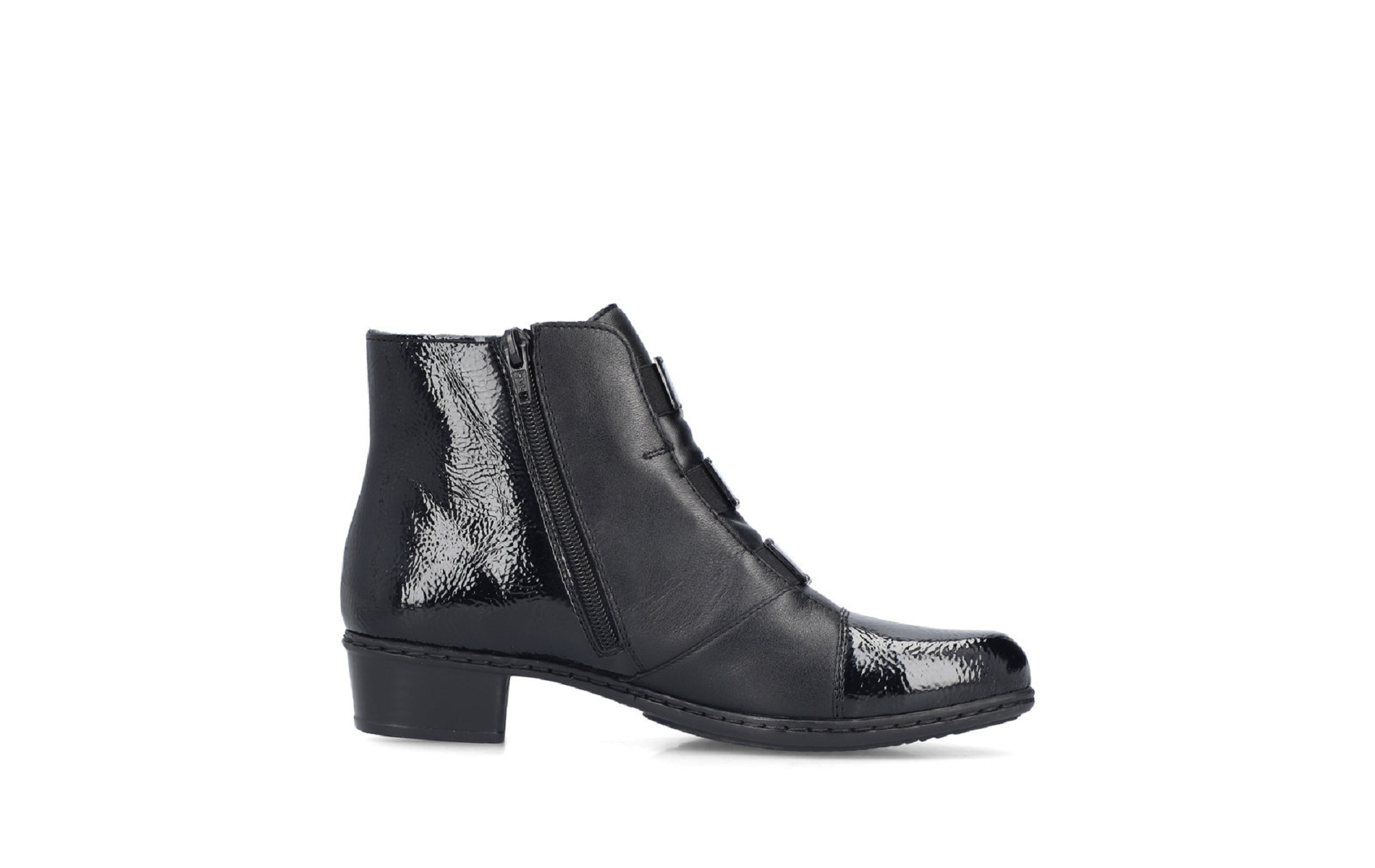 Bottine Riekerfemme Y0764 02 en cuir noir et vernis.