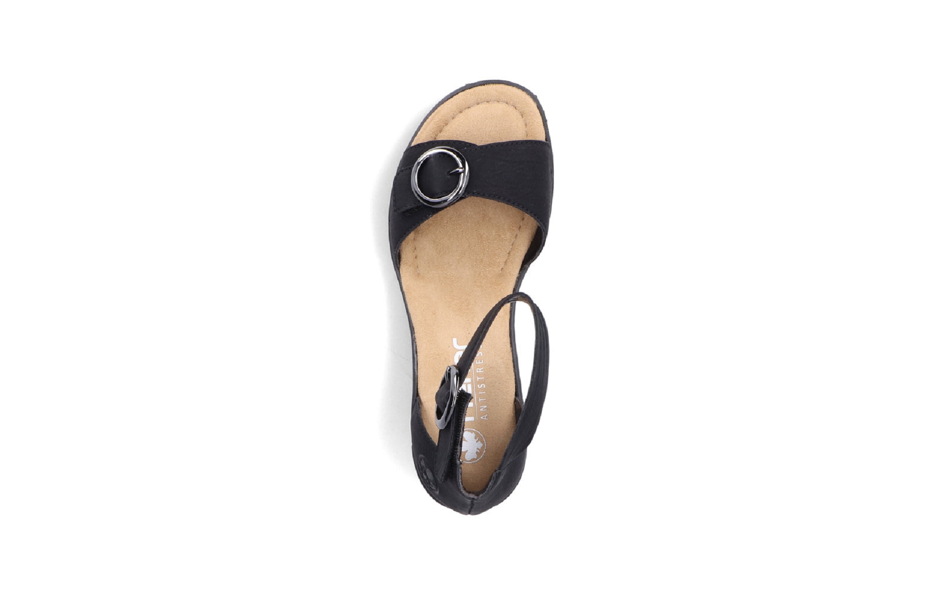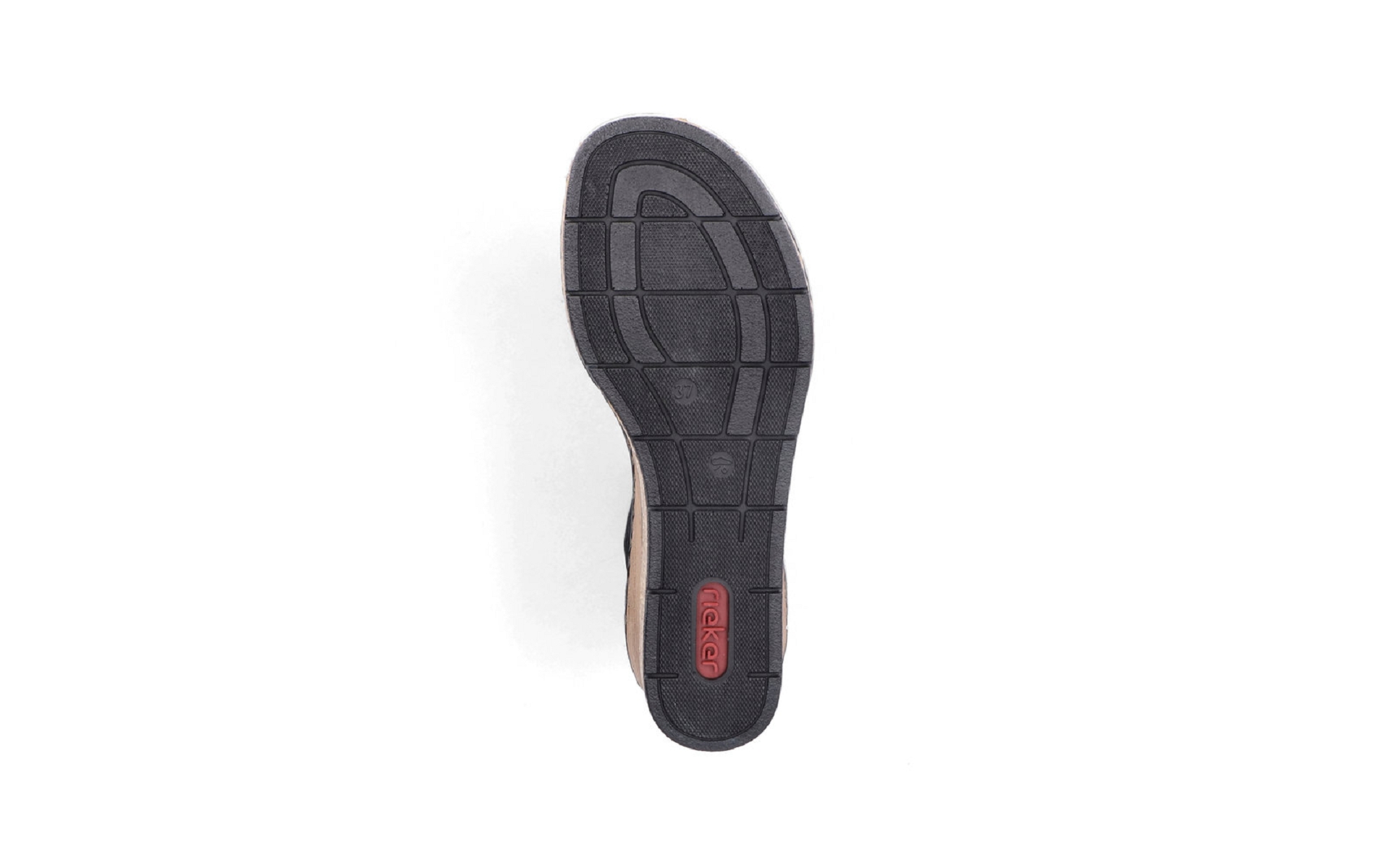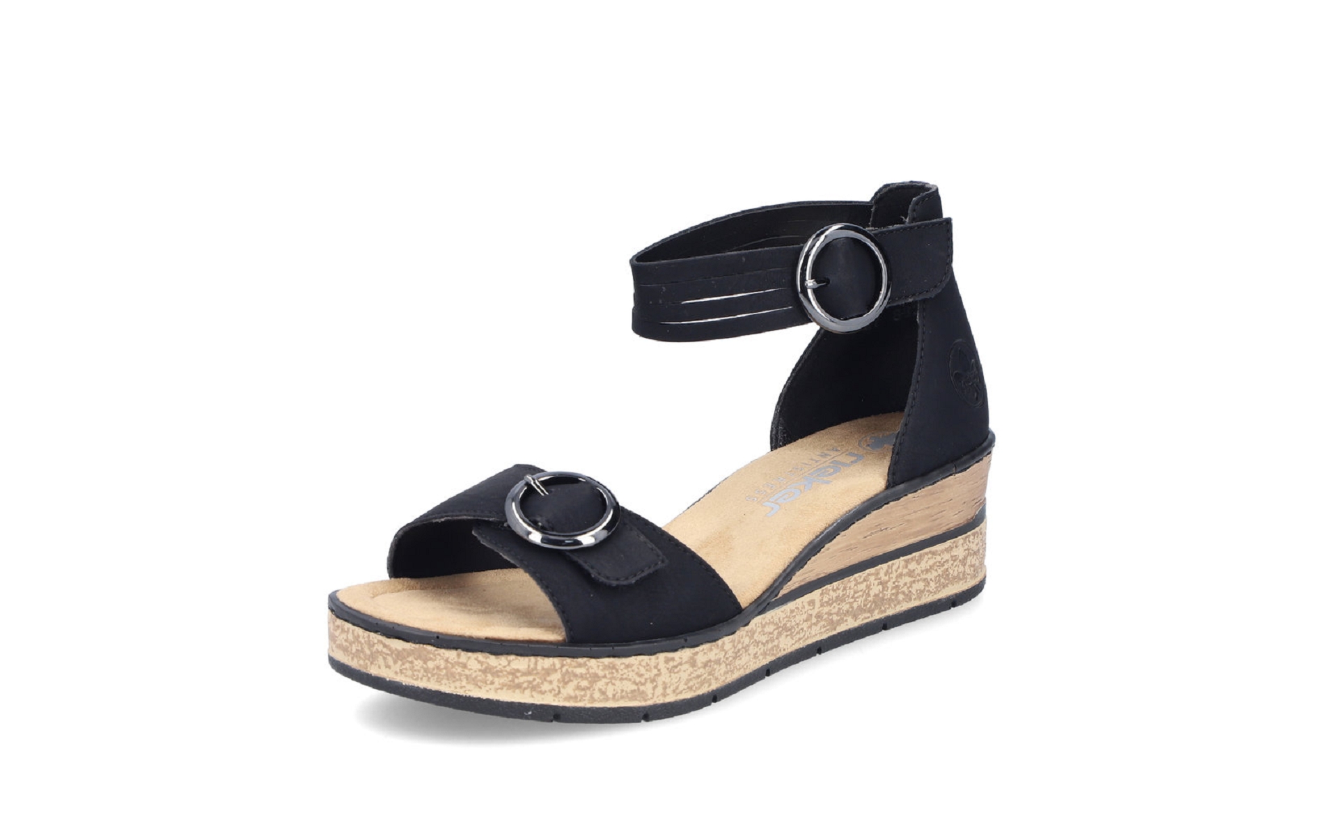 Cette chaussure qui possède deux brides réglable et un talon compensé est à découvrir chez Rieker-webstore.fr.