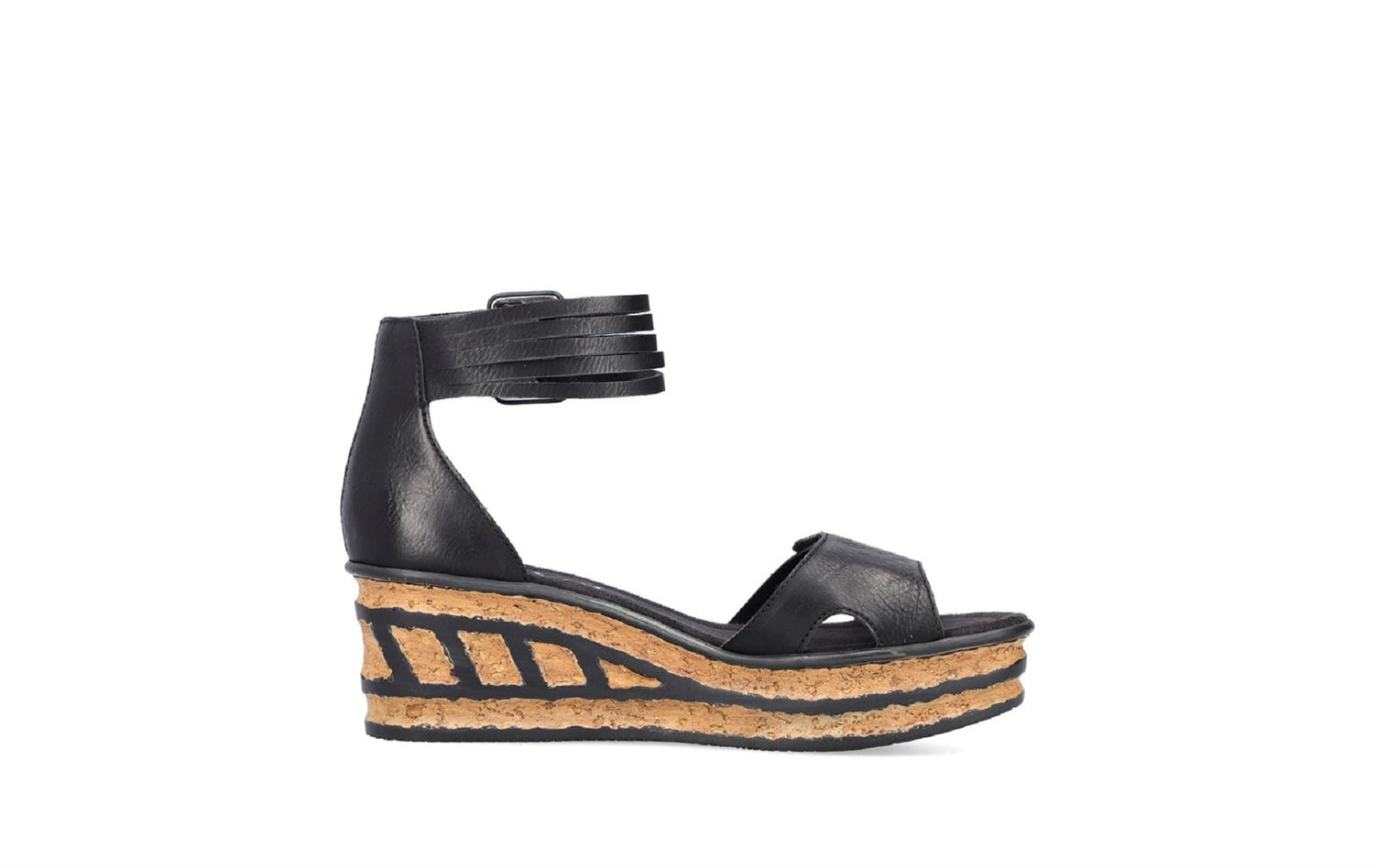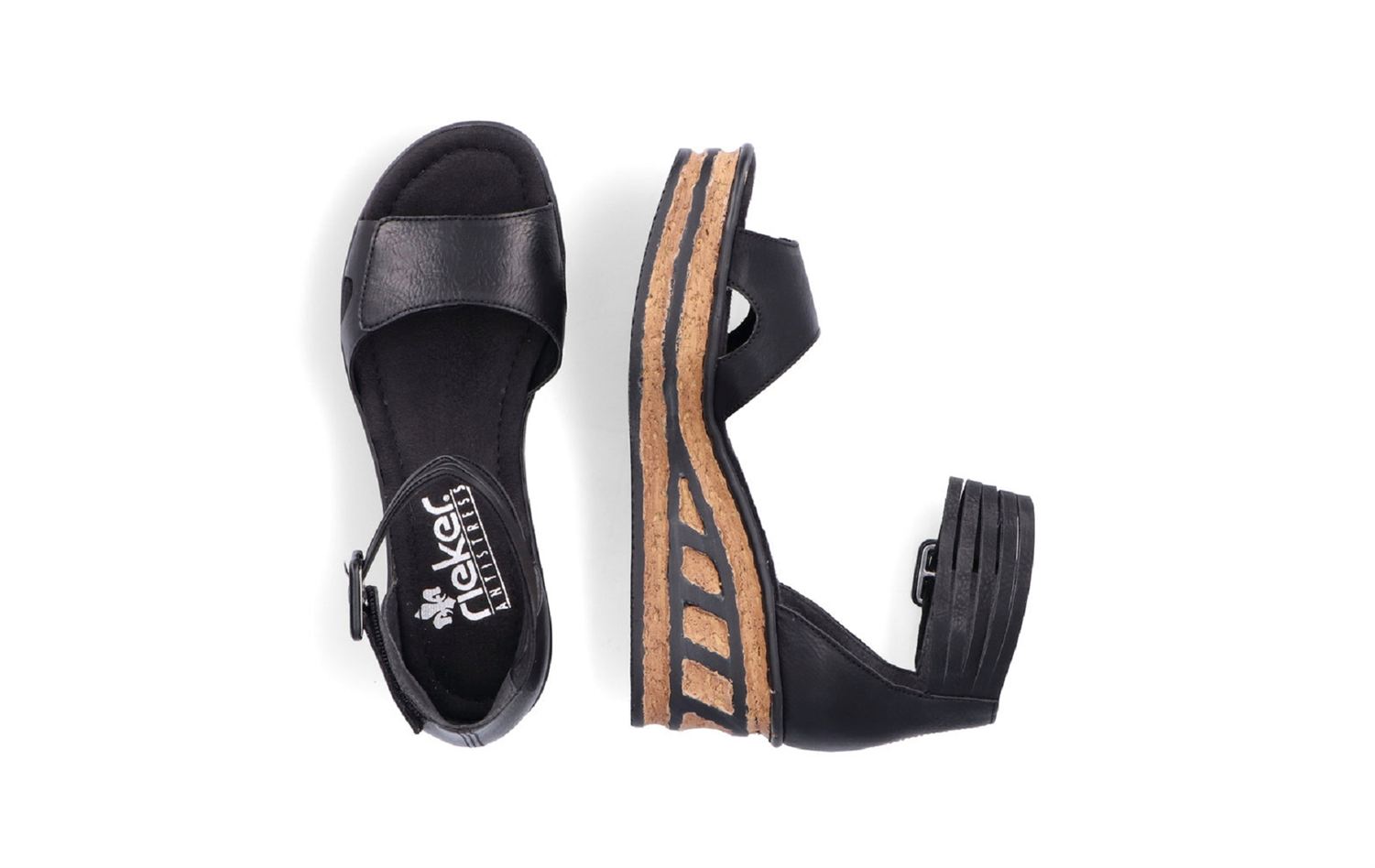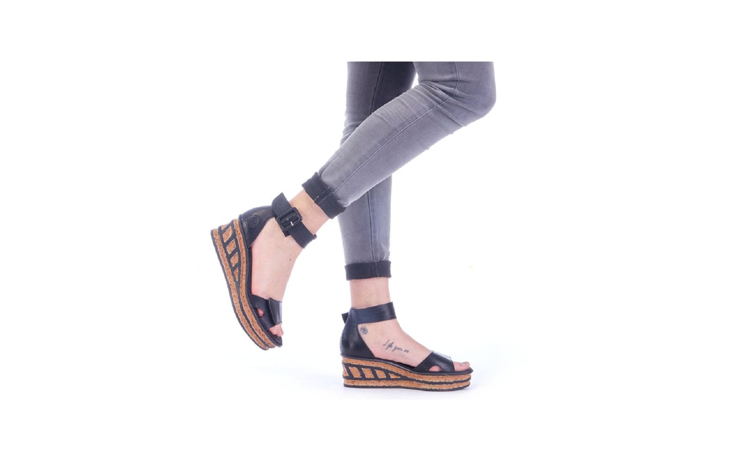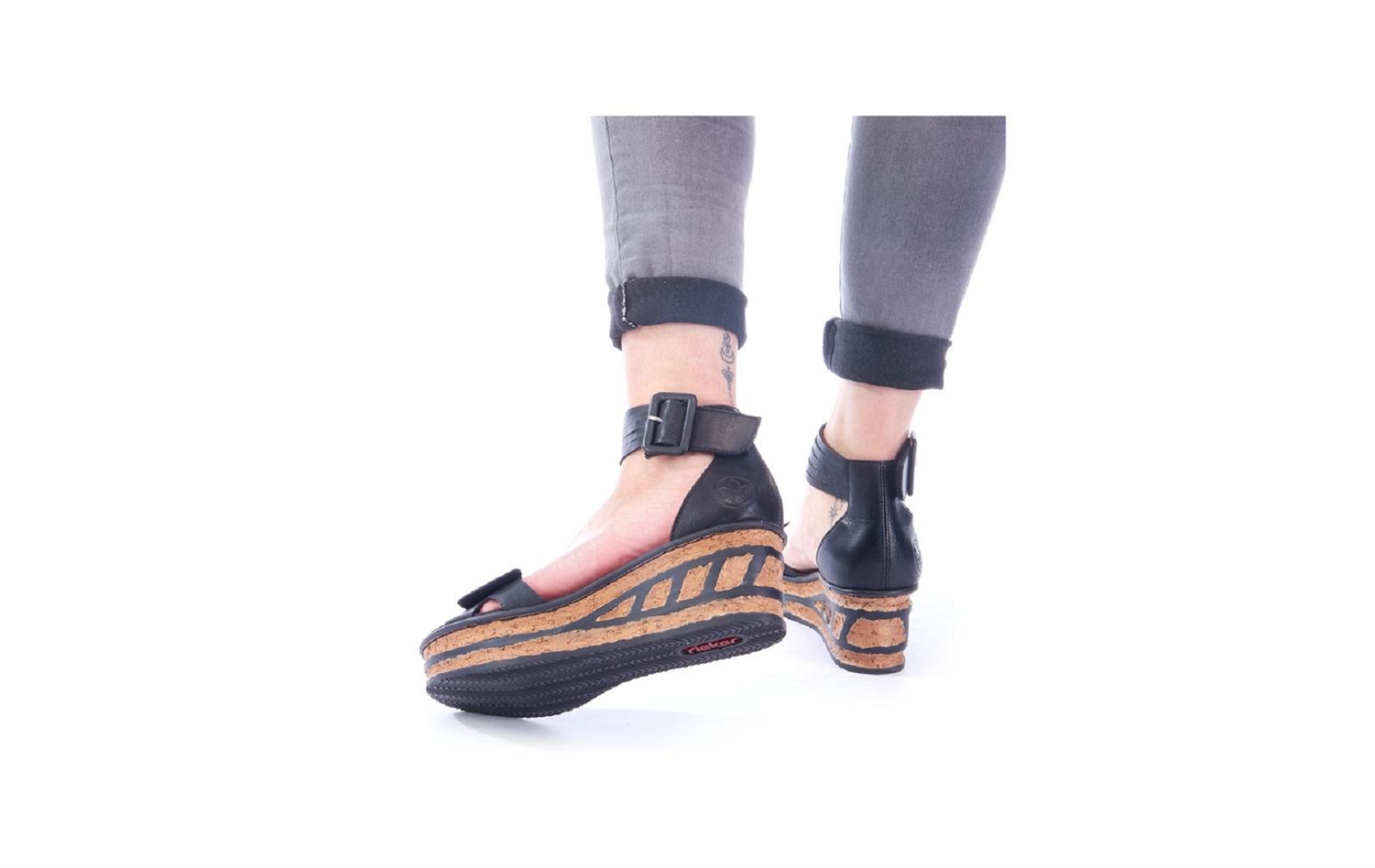 Cette chaussure qui possède deux brides réglable et un talon compensé est à découvrir chez Rieker-webstore.fr.