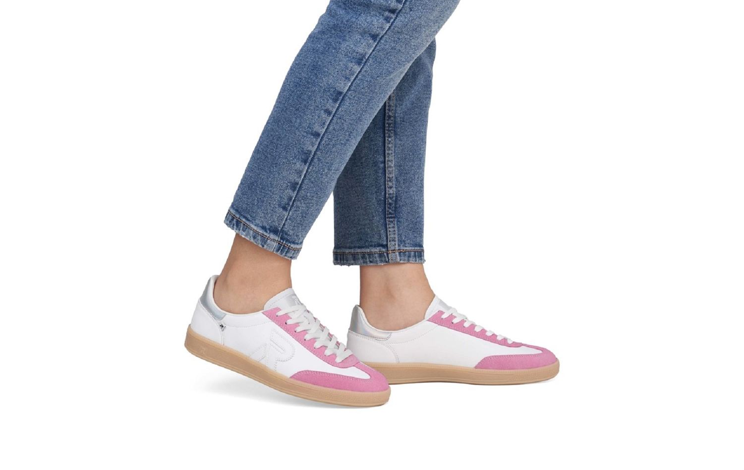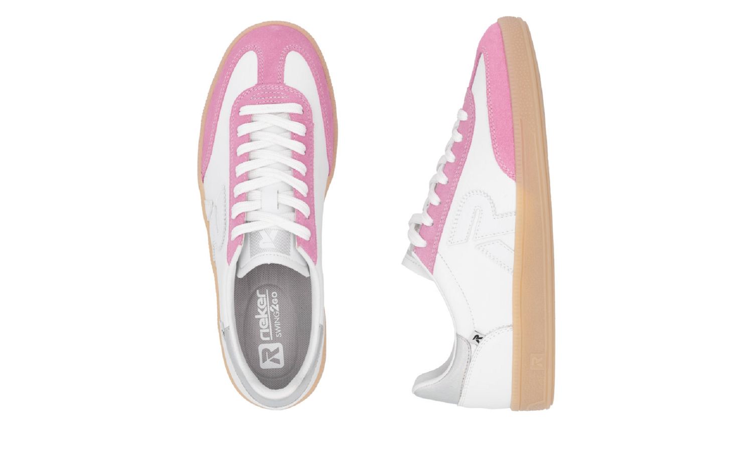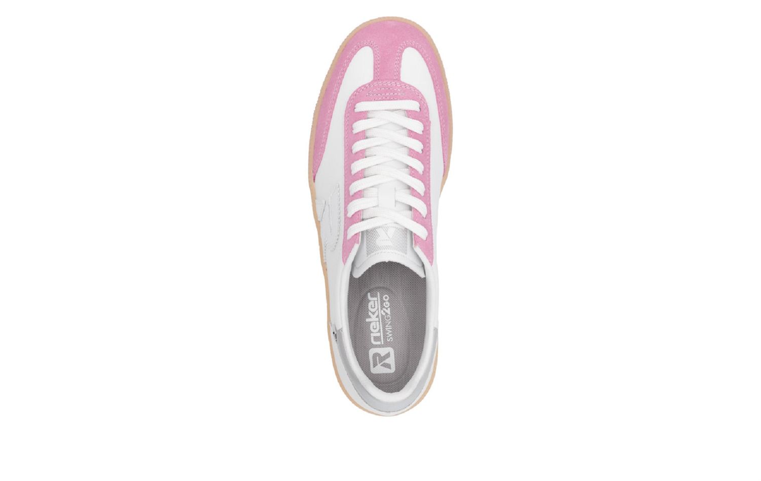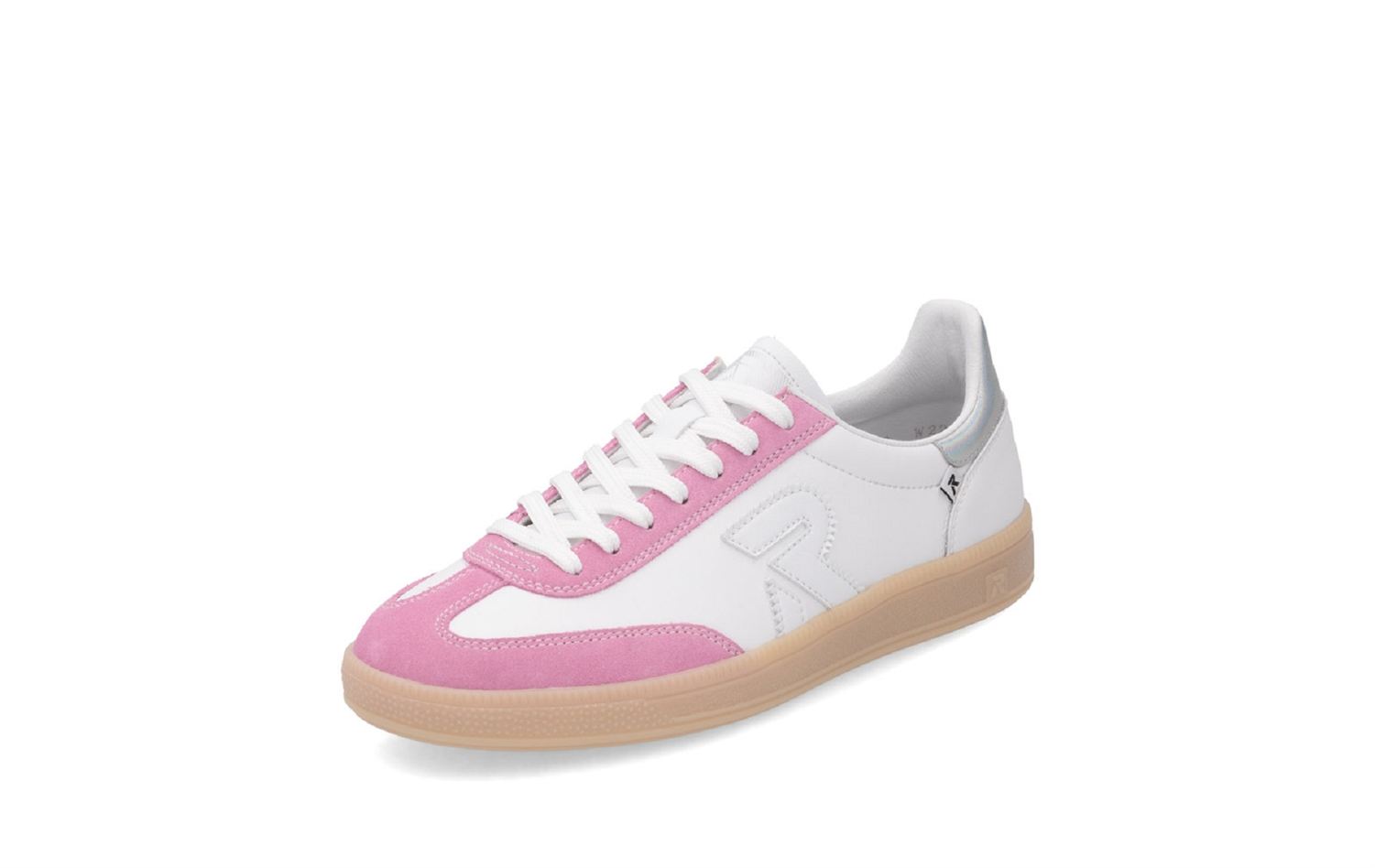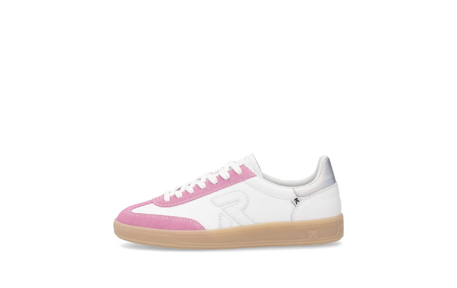 RIEKER W2200 86 est une tennis femme en cuir enduit rose et blanc.